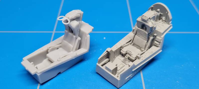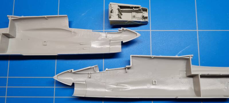 The Aires cockpit has been successfully installed. The two fuselage parts are glued together, despite Hasegawa's always reasonably good fit, I now had some problems with it. The wing parts have also been installed, the only thing I want to do is to upgrade the inside of the wing section in the fuselage with extra wiring and tubes using lead wires from ASK.